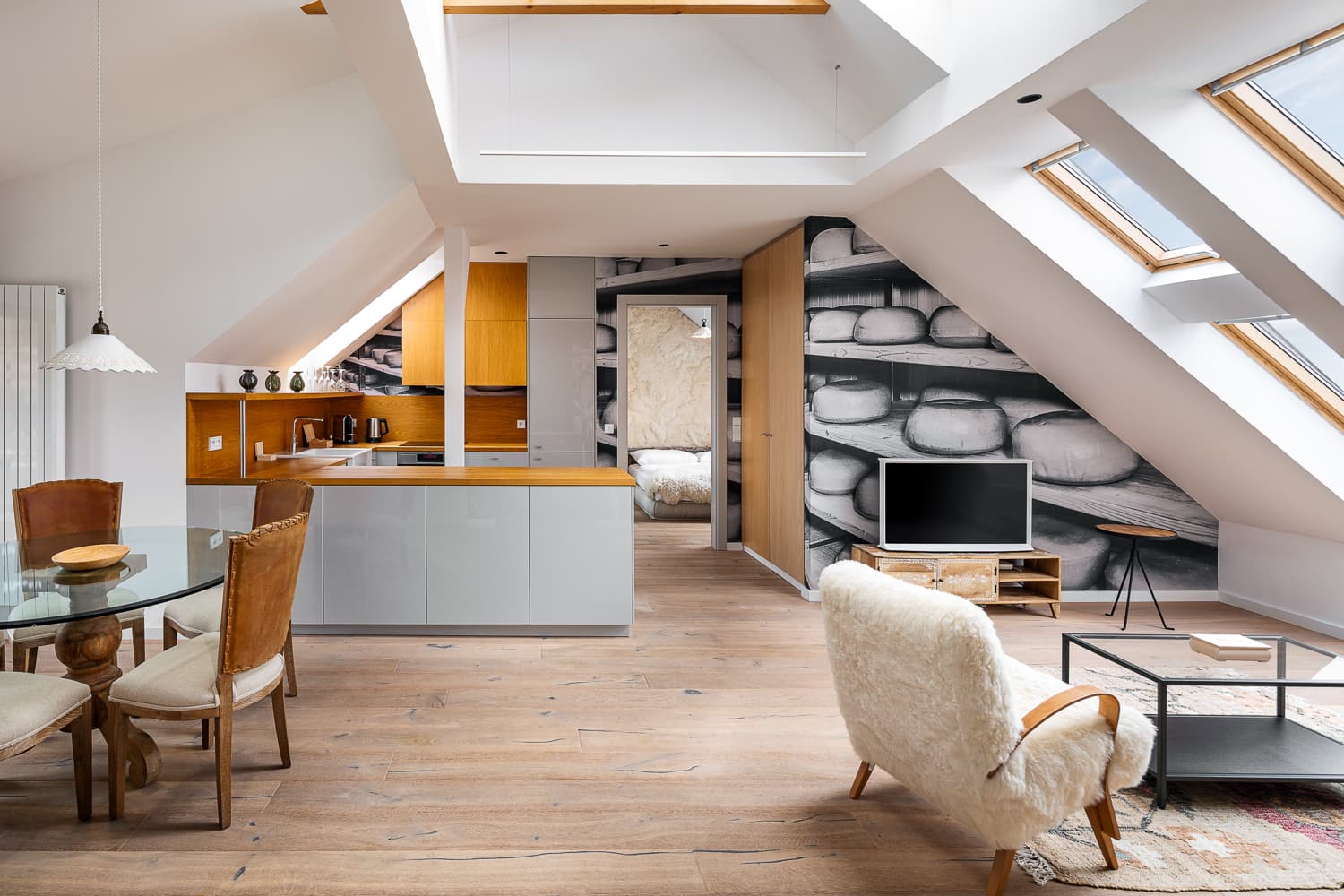 Es befindet sich im oberen Stockwerk und ist über eine Treppe erreichbar. Beim Betreten erwartet die Gäste jedoch ein außergewöhnlich großzügiger Raum: ein weitläufiges Wohnzimmer mit großer Sitzecke, Essbereich und voll ausgestatteter Küche – ideal für gemeinsame Momente.
