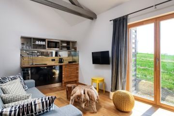 Vstupte do světa, kde se moderní minimalismus snoubí s hřejivými prvky venkovského resortu. Spodní patro je zasvěceno společným chvílím a relaxaci – najdete zde plně vybavený obývací prostor a praktickou kuchyňku (Kitchenette), ideální pro přípravu rychlého občerstvení či rodinné snídaně. Samozřejmostí je prvotřídní Nespresso kávovar pro dokonalý start do každého dne. Stoupněte si k velkoformátovému oknu a nechte se okouzlit dechberoucím panoramatickým výhledem na dominanty regionu.