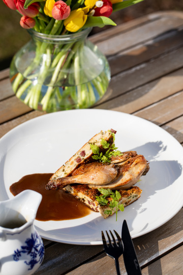 Pečené baby kuřátko, kopřivová nádivka, glazovaná mrkev, kuřecí jus